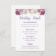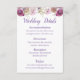 Fügen Sie diese schöne Aquarellkarte für Hochzeitszittel hinzu, um wichtige Informationen über Hochzeiten zu erhalten. Mit einem weißen Hintergrund wird der gesamte Text in einem schönen lila Schriftart dargestellt. Die Oberseite der Karte hat eine wunderschöne Aquarellblütenkunst. Personalisieren Sie Ihre Kapselkarte heute!