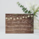 Verkünden Sie Ihren besonderen Tag mit diesen rustikalen Hochzeit Save The Date Karten mit Lichterketten, Mason Jar Lichtern und verwittertem Landbarn Holz. HILFE. Für Design-Hilfe oder wenn Sie koordinierende Artikel wünschen, kontaktieren Sie den Designer über Zazzle Chat oder makeitaboutyoustore@gmail.com.