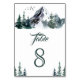 Elegante Tischnummer zum Thema Hochzeit im Wald mit wunderschönen Bergen und Kiefern auf weißem Hintergrund.