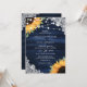 Rustikal marineblaue Hochzeitseinladungen mit Sonnenblumen auf einem rustikalen Holzfußboden mit weißem Blumenzauber.