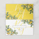 Dieses Design zeichnet sich durch eine elegante und dennoch einfache Anordnung der personalisierten Initialen der Braut und des Bräutigams aus, gerahmt durch Vintage Illustrationen von Zitrusfrüchten und Zitronen. Der Text wird oben auf die Initialen der Braut und des Bräutigams gesetzt, die in gelber Farbtypografie dargestellt sind. Dieses gelbe, weiße und grüne Design ist einfach, aber elegant in jeder Hinsicht. Die Rückseite zeigt einen farbigen, Zitronengelben Hintergrund mit den Initialen in Weiß und Zitrusakzenten oben und unten. Die Kombination von Farben schafft einen eleganten, trendigen und schicken Stil. Elegantes Hochzeitsdesign mit modernen Elementen in der Platzkarte. Auch die passenden Hochzeitseinladungen und die Stationery-Artikel sind verfügbar.