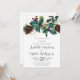 Heilige und rote Beeren, Kiefernäste und Kiefernzapfen sind von goldenen Funkeln umgeben und sorgen für eine rustikale und elegante Wintereinladung.