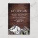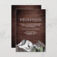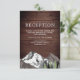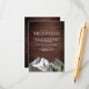 Elegante rustikale Hochzeitskarte mit schneebedeckten Bergen und Pinienbäumen mit moderner Typografie vor einem Stallholzhintergrund.