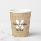 Burlap rustikale Hochzeitsempfang maßgeschneiderte Monogramm Papier Becher. Diese Papiertassen verfügen über ein gedrucktes Einbruchbild mit dem Monogramm, den Namen und dem Hochzeitstermin oder dem Datum eines anderen Ereignisses.