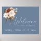Rustikales Dusty Blue Peach Floral Wedding Willkommenszeichen. Mit diesem elegant gestalteten Hochzeitszeichen laden Sie Ihre Gäste stilvoll zu einem Hochzeitsfest ein. Auf einem staubblauen Hintergrund vermischen sich staubblaue, pfirsichgrüne und olivgrüne Blume. Dieses Hochzeitsschild hat ein wunderschönes Blumenmuster und ein botanisches Design, mit rustikalen und bohobolden Farben, die perfekt für Ihre Blumenhochzeit oder Wildblume-inspiriert Hochzeit. Die minimalistische und einfache Anordnung verleiht dem üppig pfirsichfarbenen, eleganten Set der Blumenelemente auf einem auffallend staubblauen Hintergrund Aufmerksamkeit. Dieses Hochzeitszeichen wird den Ton für eine wunderschöne Hochzeitslandschaft mit einer staubblauen Hochzeitsdekoration und pfirsichfarbenen und cremefarbenen Wildblumen Set. Eine perfekte Ergänzung zu jeder botanischen oder boho-chic Feier.