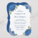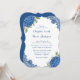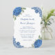 Rustikal blaue Hydrangea Hochzeitseinladungen mit blauen Hydrangea-Blume, Babyatmen und Grün auf einem schlichten, weißen Hintergrund mit blauen Blumenmotiven.