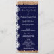 Die vertikalen Hochzeitsprogramme haben einen marinen Hintergrund und eine bedruckte Spitze und eine Einengung um die Kanten. Fügen Sie Ihre Hochzeitsreihenfolge und die Informationen zu Hochzeitsfeiern sowohl auf der Vorderseite als auch auf der Rückseite des Programms hinzu. Sie können beliebige Textfelder aus der Schaltfläche "Anpassen" hinzufügen oder löschen.