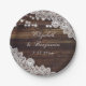 Elegante und romantische rustikale Hochzeitsfeier Teller inspiriert von Stallholz, weiße Blumenspitze und Lichter an der Saite.