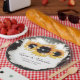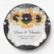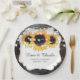 Spezielle rustikale Holz- und Sonnenblumen Hochzeitspapiere Teller mit Sonnenblumengeschirr und Lichtern auf einem Stallholzhintergrund. Matching Artikel zur Ergänzung dieser rustikalen Blumenzettel Teller. Individualisieren Sie sich ganz einfach auf jeden Anlass.