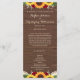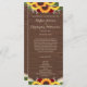 Dieses rustikale Landdesign besticht durch goldfarbene, weiße Lichter, Vintage Spitzen, gelbe Sonnenblumen, bordeauxrote rote Rosen und den Atem des weißen Babys vor einem dunkelbraunen Holzboden. Auf der Vorderseite und hinten erscheint ein benutzerdefinierbarer Text in goldweiß in beliebter Schrift und Serifentypografie auf dem gleichen dunkelbraunen Holzhintergrund. Sie können dieses Programm für Ihre eigene Hochzeit personalisieren, indem Sie den Text in der Vorlage ändern.