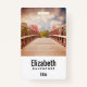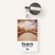 Abzeichen mit personalisiertem Namen mit landschaftlichem Foto. Eine Holzbrücke führt zu einem Weg, der von farbenwechselnden Waldbäumen umgeben ist.
