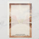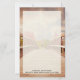 Papier aus Papier mit landschaftlichem Foto. Eine Holzbrücke führt zu einem Weg, der von farbenwechselnden Waldbäumen umgeben ist.