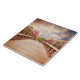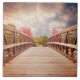 Keramik Kachel mit einem landschaftlichen Foto. Eine Holzbrücke führt zu einem Weg, der von farbenwechselnden Waldbäumen umgeben ist.