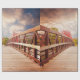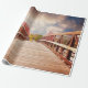 Umhüllungspapier mit einem landschaftlichen Foto. Eine Holzbrücke führt zu einem Weg, der von farbenwechselnden Waldbäumen umgeben ist.