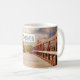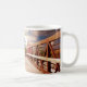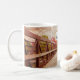 Eine Tasse mit einem landschaftlichen Foto. Eine Holzbrücke führt zu einem Weg, der von farbenwechselnden Waldbäumen umgeben ist.