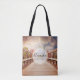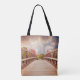 Eine Tasche mit einem landschaftlichen Foto. Eine Holzbrücke führt zu einem Weg, der von farbenwechselnden Waldbäumen umgeben ist.