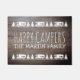 Niedliche, personalisierte rustikale RV-Campingsdekorfußmatte für rvers, pensionierte Paare und die beunruhigten Camper, rustikale hölzerne Blickfußmatte lasen glückliche Camper in handgeschriebenem schauendem Druck, weiße Buchstaben mit einer Textschablone für das Addieren des Familiennamens unten in den wunderlichen Buchstaben. Mit einer niedlichen, weißen Cartoongrenze an der Spitze und Unterseite von motorhome RVs und von Kiefernbäumen. Gegen einen tatsächlichen Fotohintergrund des geschrammten, rustikalen, beunruhigten Holzes. Großes Paarruhestandsgeschenk, auch. Würde zu Hause vor einem RV oder einem gemütlichen Blockhaus recht schauen.