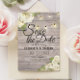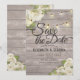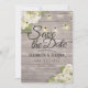 Save the Date Hochzeitskarte Vorlagen - Weiße Rosenblumen und Streichelleuchten auf rustikalem Holzhintergrund. Ein perfektes Design für Ihren großen Tag! Alle Textstile, Farben, Größen können an Ihre Bedürfnisse angepasst werden.
