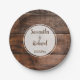 Rustikale Hochzeitspapier-Teller mit braunem, bedrücktem Holzstruktur. Personalisieren Sie die Imitat Holzpapier Teller mit Braut- und Bräutigamen und Hochzeitstag.