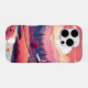 Ein ruhiges digitales Gemälde einer gemütlichen Hütte, eingebettet in einen kurvenreichen Fluss, umgeben von blühenden Orange- und Rotherfeldern, mit Bergen und einem bunten Himmel im Hintergrund.