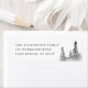 Eine rustikale, handgemalte Rücksendemarke mit Aquarellkiefern auf einem miessigen Hügel.