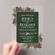 Lade deine Liebsten ein, an deiner Freude an deinem Hochzeitstag mit diesen wunderschönen Acryl-Einladungen teilzuhaben. Das stilvolle Boho-Chic-Design zeigt Ihre Namen prominent in fetter Schrift, während die Einführung und andere Notizen elegante Kalligrafie mit Schwüngen an den Enden der Buchstaben aufweisen. Der Text wird auf einem marmorierten, waldgrün gefärbten Hintergrund angezeigt. Der äußere Rand der Einladung besteht aus transparentem Acryl mit handgemalten Kiefernzapfen und Kiefernzweigen, die die Ecken schmücken. Elegant, klassisch, raffiniert und schön - diese Hochzeitseinladungen sind perfekt für eine Winter- oder Berghochzeit.