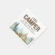 Diese lustige rustikale Kollektion hat einen holzverkleideten "CAMPER" und Skript-Schriftart. Der Boden hat einen Aquarellwald, Berge und Landschaft. Es ist mit den bräunlichen, grünen und braunen Camping, die ein Zelt und Feuer einschließen, fertig. Der Rücken hat ein Muster des gleichen Aquarellzeltes.