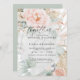 Einladung zur Hochzeit | Wasserfarbenfroher Blumenstrauß in korallenrosa Rose Rosa Blüte und blassgrünes Blattwerk mit zartem beigen Palmgras. Dies ist Teil einer Sammlung von Hochzeitsartikeln mit passendem Hochzeitszubehör. © Whimsical Artwork erstellt für den BarefootBride™