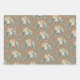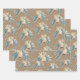 Eine rustikale Kraft-farbige Urlaubspackung mit Aquarellfarben goldfarbenen Urlaubsklobeln mit Farbband und blauen Fichtenbäumen in einem Wiederholmuster von drei verschiedenen Größen.