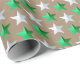 Ein rustikales Packpapier für den Weihnachtsurlaub mit leuchtend grünen und silbernen weißen Sternen in einem wiederholten Muster auf einem warmen Kraftpapier.