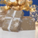 Ein kraftstofffarbenes Packpapier mit großen und kleinen schimmernden silber- und pulverweißen Schneeflocken.