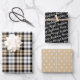 Das rustikale, moderne Geschenkverpackungs-Set verfügt über drei neutrale, koordinierende Packpapierblätter: klassisches kariertes Armband-, Weiß- und Schwarzuhr-Muster, Schwarz mit weißem Schriftzeichen "Frohe Weihnachten" und kraftpapierige Farbe mit wenig weißen Kiefernmärchen.