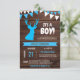 Fantastisches rustikales, Landdollarthema-Babyduscheneinladungen für Jungen. Blaues Silhouettedollarrotwild auf rustikalem Holz täfelt Hintergrund und hängende Bauchflaggen. Blaues /turquoise und weiße Farben auf braunem dunklem Holz. ITIS EIN JUNGE! Einladungs-Vorlagen. Editable Text. Get zusammenpassende Aufkleber!