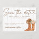 Set den Ton für deine Western Hochzeit mit diesem rustikalen Land Save the Date mit charmanten Cowgirl Stiefeln, einem Cowboyhut und sanften Blumenakzenten auf einem rustikalen Holzboden. Dieses Design, das sich perfekt für Brautpaare und Brauereifeiern eignet, verbindet südländischen Charme mit romantischer Eleganz. Personalisieren Sie mit Ihren Namen, Datum und Veranstaltungsdetails, um einen Sake zu erstellen, den Ihre Gäste Liebe. Ideal für Hochzeiten mit Western, Cowboy, Rustikal oder im Freien.