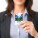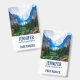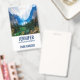 Namensschild mit einem schönen Foto einer angenehmen und ruhigen Naturlandschaft. Lebhafter grüner Wald im Vordergrund und schattige blaue Berge im Hintergrund. Mit einem traumhaft bewölkten weißen Himmel. Legende und magische Gefühle. Ideal für Freiberufler.
