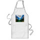 Eine Schürze mit einem schönen Foto einer angenehmen und ruhigen Naturlandschaft. Lebhafter grüner Wald im Vordergrund und schattige blaue Berge im Hintergrund. Mit einem traumhaft bewölkten weißen Himmel. Legende und magische Gefühle.