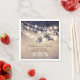 Herrliche und romantische Papierservietten mit blauen rustikalen Saitenleuchten, die an den alten Eichenfässern hängen.