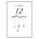 Rustikale Laternen, die an Tischnummern eines Baumzweiges hängen.