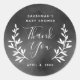 Eine rustikale Babydusche, die sich bedankt, ist ein von Stacey Meacham entworfener Aufkleber mit künstlerisch gezeichneten Lorbeerzweigen und Kalligraphie, der auf einem schwarzen Kalkbrett mit Textur in Weiß zu sehen ist.