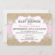 Rustikaler Babypartyeinladungs-Kartenentwurf mit rosa Kontrast und weiße Spitze über Leinwand masern Hintergrund.