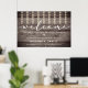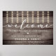 Rustikal und elegant mit Kalligrafie "welcome" bietet Imitat dunkelbraunes Holz mit Saitenleuchten, die das Hochzeitsschild hinabhängen.