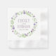 Rustikale, schicke Hochzeitsnapkins sind mit einem Blumenkränzrahmen aus Lila, Lavendel, Violett, Pflaumenviolett und grünen botanischen Blätter mit handgezeichnet Aussehen ausgestattet. Personalisieren Sie mit den Braut- und Bräutigamen und dem Hochzeitstag.