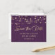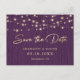 Personalisierte rustikale, lila Hochzeit bewahrt die Dattelkarten mit einem rustikalen Holzhintergrund, der mit Saitenlichtern und einem eleganten Script-Schriftart geschmückt ist. Diese rustikale, schicke Save the Date Postkarte mit Ihren Hochzeitsdetails ganz einfach personalisieren. Für individuelle Anfragen willkommen.