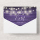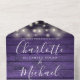 Alles in einer Hochzeitseinladung mit hübschen Saitenlichtern, prächtigen Stilnamen und schicker Typografie auf rustikalem lila Holzboden. Die Einladung enthält eine perforierte RSVP-Karte mit Ihrem Hochzeitswebsite QR Code und Details. Entwickelt von Thisisnotme©