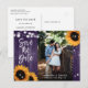 Rustikale Blumenhochzeit speichert das Datum der Foto Postkarten mit Sonnenblumen und Streichellichter auf einem Stallholzhintergrund. Ideal für eine lila, rustikale Hochzeitsfeier, die von Sonnenblumen inspiriert wird. Monogramm Hochzeit speichern Sie das Datum Postkarte.