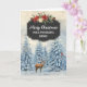 Frohe Weihnachten für Mama-Karte mit rustikalem Country-Chalkboard-Muster und schneebedeckten Wasserfarbenwald-Szene mit Hirsch und Vögeln.