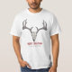 Der T - Shirt eines Bauernhauses zeigt eine handgezeichnet Abbildung eines Hirschkopfschädels und eines Rentierschädels in schwarzer Tinte. Alle Texte können bearbeitet werden. Personalisieren Sie Ihren Urlaub mit Ihrem eigenen Namen.