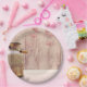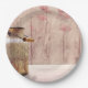 Papier Teller mit einem rustikalen Landdesign. Eine alte rostende Milch kann mit Weizen und verblassten roten Mohn im Hintergrund Set vor einem schwachen Holzpaneel. Holz ist nur ein Bild, nicht real.