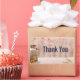 Vielen Dank an die Aufkleber mit einem rustikalen Landdesign. Eine alte rostende Milch kann mit einer hübsch orangefarbenen Blume. Weiße und verblasste rote Pupien im Hintergrund Set vor einem schwachen Holzpaneel.