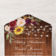 Rustikale Hochzeit, Watercolor Burgund Blumen, Holz und Streichellichter Hochzeit All In One Einladung mit RSVP Card beinhaltet bordeauxrote Rose, rosa Rosen, rote Rosen, Sonnenblumen und botanisches Grün.